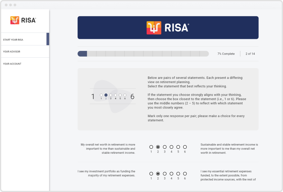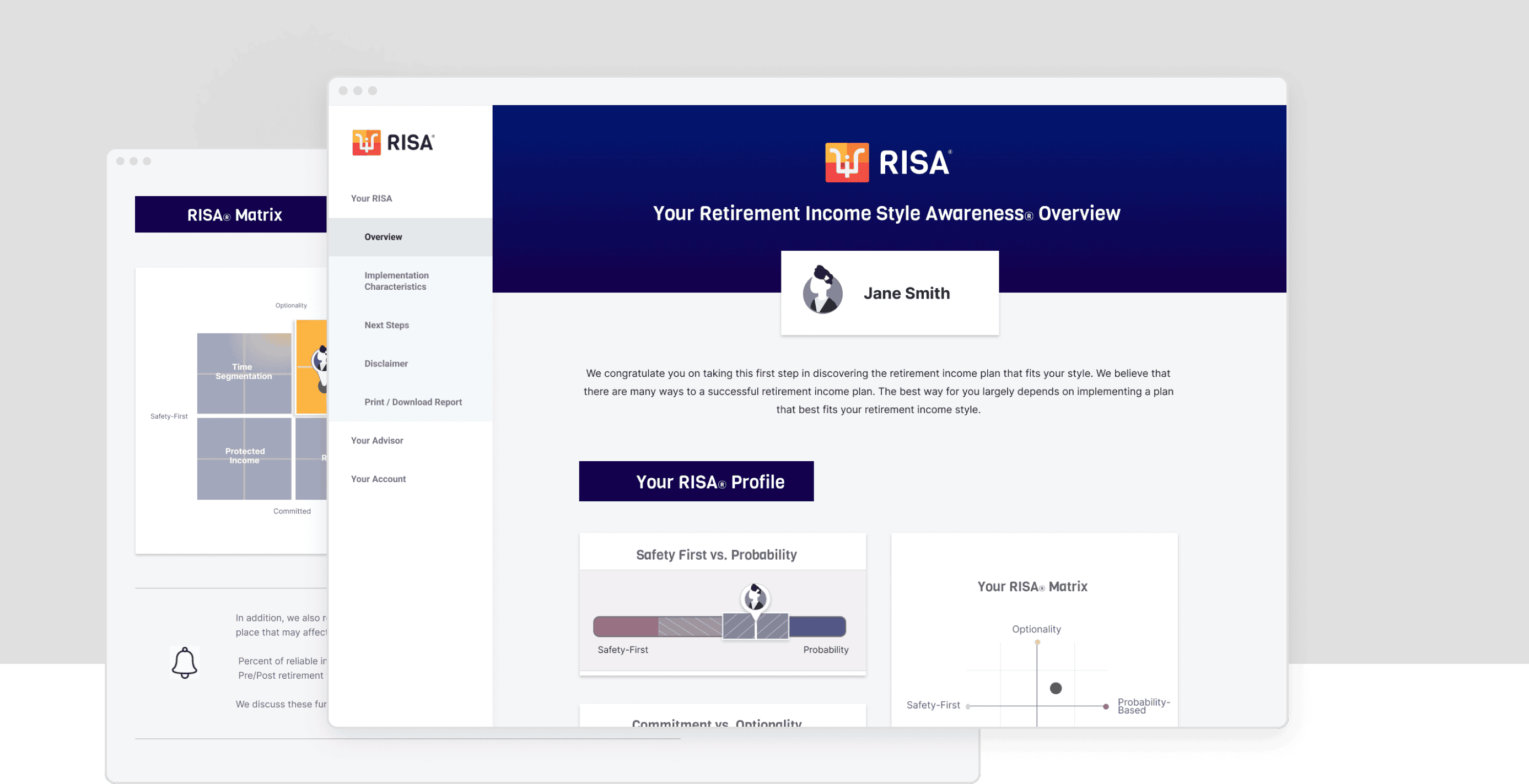 RISA®, which stands for Retirement Income Style Awareness, is a 15-minute assessment designed to help you more clearly understand which retirement income strategies align most closely with your preferences.