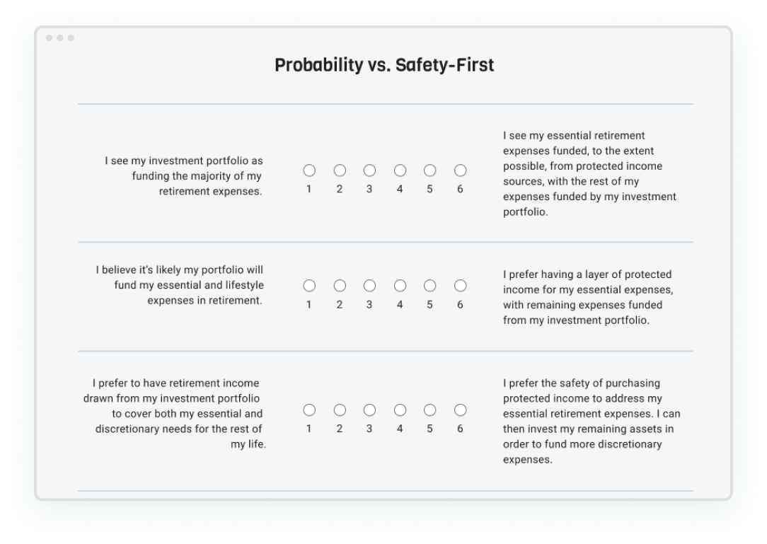 After creating an account, you’ll be asked a series of questions that will help determine your retirement income preferences.
