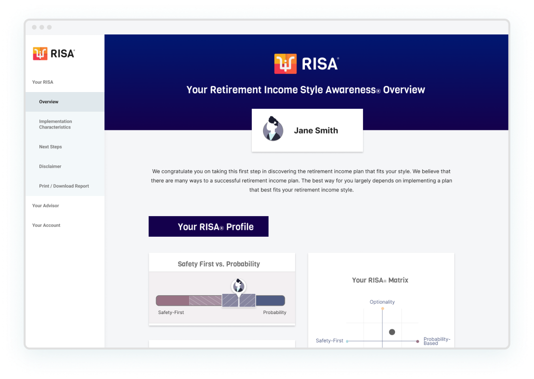 After completing the questionnaire, you’ll be presented with your RISA report, which will explain how you scored and give you insights into how you’ll be best served in your retirement.